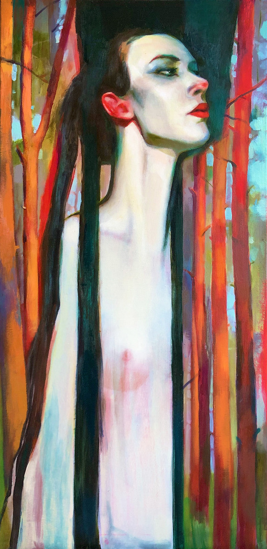 Tagad aicinu uz savu personīgo meža telpu – izstādi "Koku skaitītājas mežonīgā dzīve". Šeit esmu apkopojusi dažādas gleznas, kurās mežs ir attēlots visdažādākajos veidos – gan kā galvenais varonis, gan kā fons citiem stāstiem. Starp tām atradīsi gan vecākas, man mīļas gleznas, kā "Ikdienas laimes deva" un dažas no "Meža meiteņu" sērijas, gan arī pavisam jaunas, šīs vasaras meža tēmas interpretācijas.