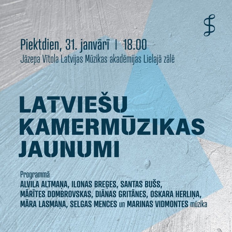 Aizraujošs vakars latviešu kamermūzikas pasaulē: jaunākie skaņdarbi un izcili mākslinieki. Latvijas Komponistu savienība ar lepnumu piedāvā koncertcikla “Latviešu kamermūzikas jaunumi” nākamo programmu, kas izskanēs 31. janvārī plkst. 18.00 Jāzepa Vītola Latvijas Mūzikas akadēmijas Lielajā zālē.