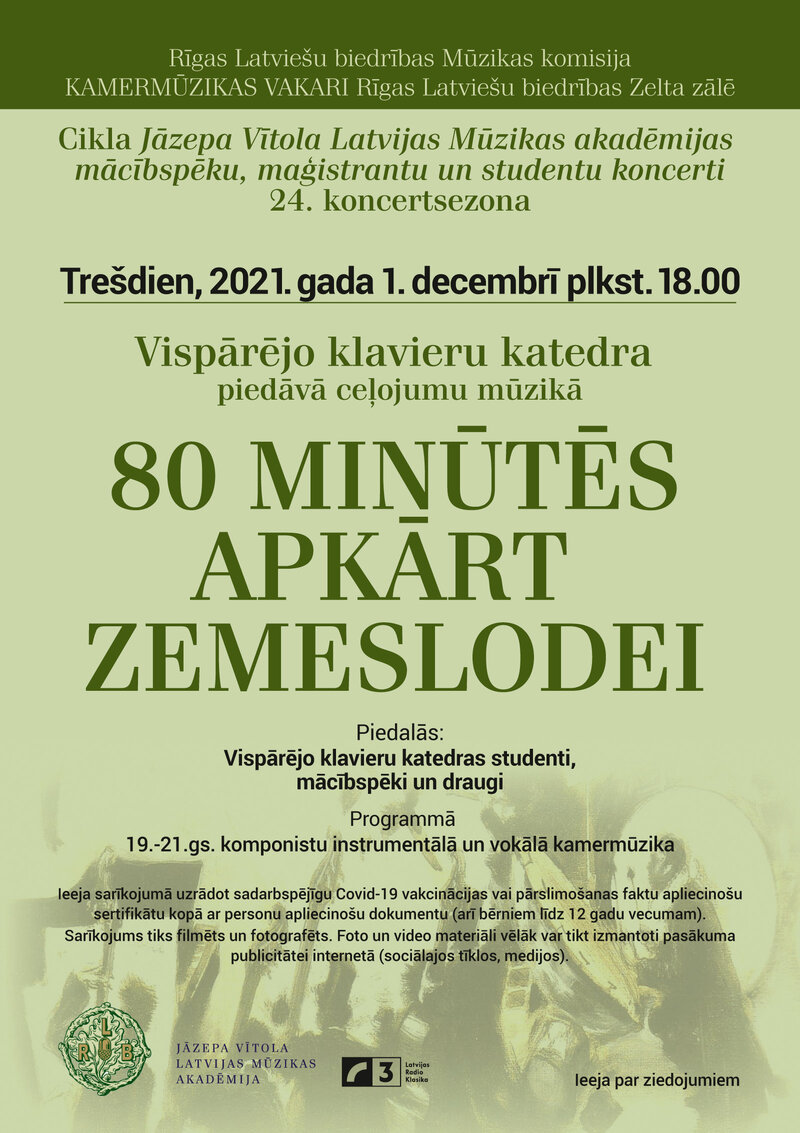 Rīgas Latviešu biedrības Mūzikas komisija, sadarbībā ar Jāzepa Vītola Latvijas Mūzikas akadēmiju, 2021. gada 1. decembrī plkst. 18.00 Rīgas Latviešu biedrības Zelta zālē aicina uz cikla "Jāzepa Vītola Latvijas Mūzikas akadēmijas mācībspēku, maģistrantu un studentu koncerti" 24. koncertsezonas vispārējo klavieru katedras mācībspēku un studentu koncertu “80 minūtēs apkārt zemeslodei”.