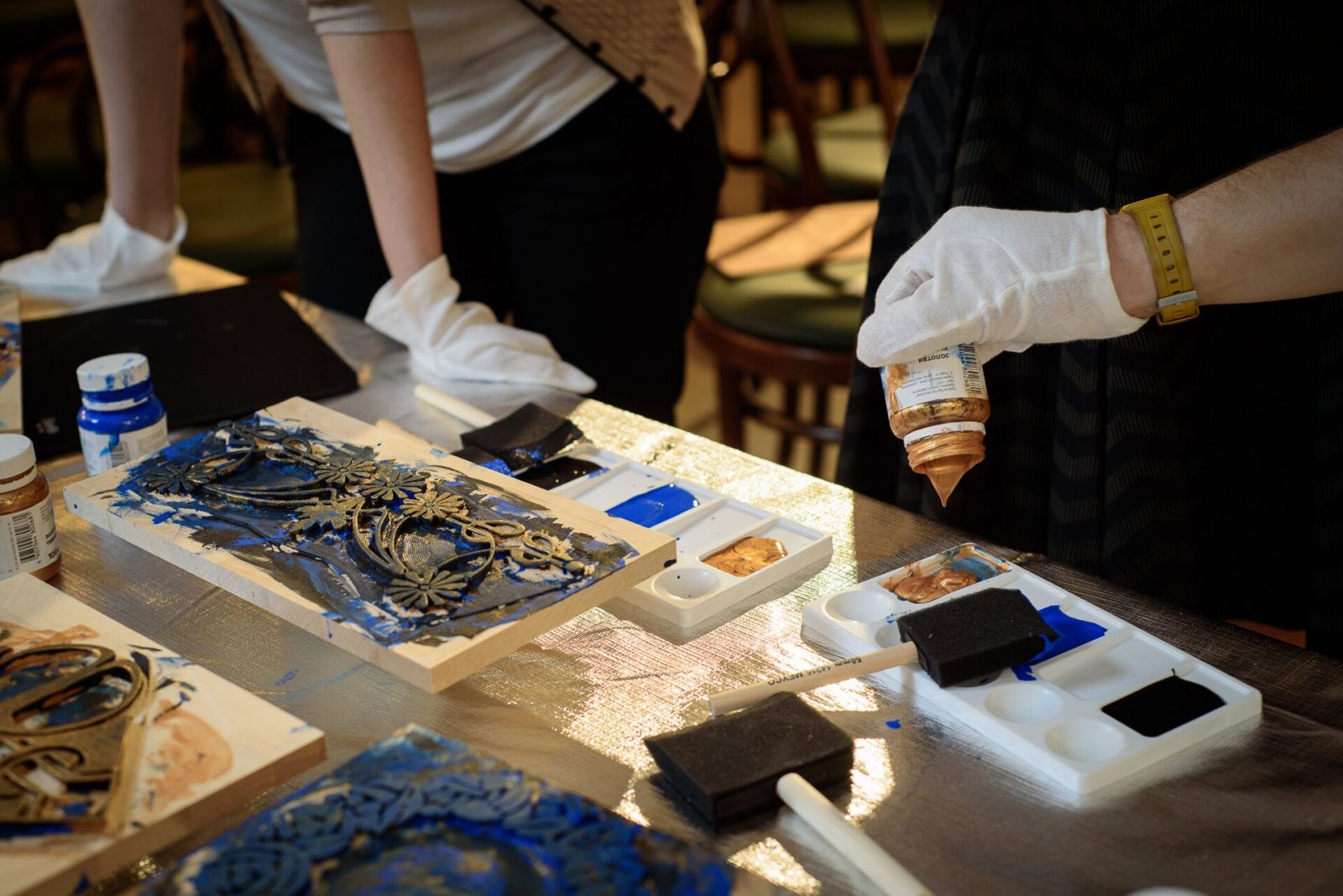 Radošajā procesā tiks izmantoti koka spiedogi ar jūgendstila ornamentiem, kas radīti, iedvesmojoties no muzeja telpās sastopamajiem 20. gadsimta sākuma siena un griestu dekoriem. Darbnīcas noslēgumā dalībnieki iegūs paša radītu mākslas darbu, kas tapis muzejā “Rīgas Jūgendstila centrs”.