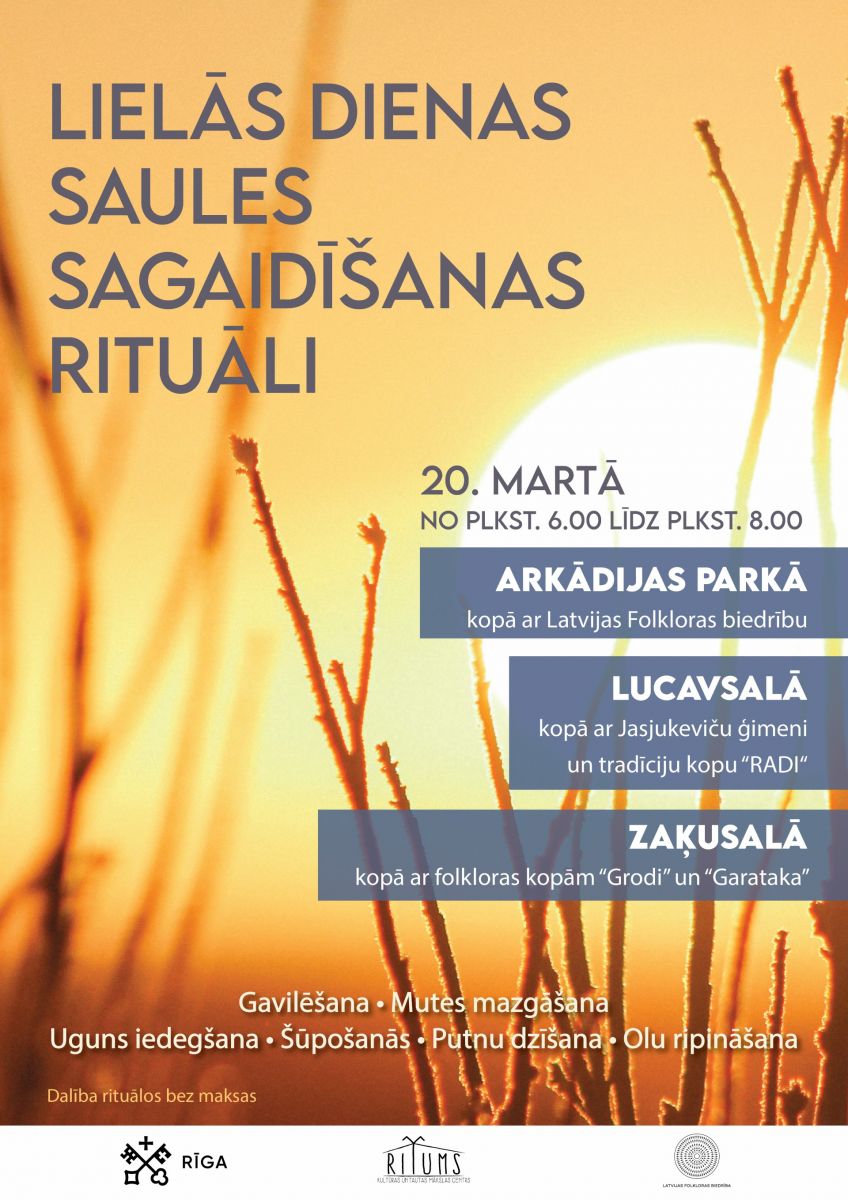 20. martā no plkst. 6.00 līdz plkst. 8.00 Kultūras un tautas mākslas centrs “Ritums” aicina svinēt Pavasara saulgriežus un sagaidīt sauli trīs norises vietās Rīgā.