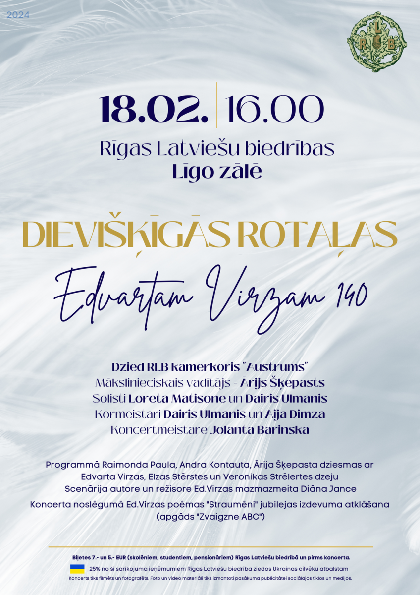 18. februārī plkst. 16.00 Rīgas Latviešu biedrības Līgo zālē notiks koncerts "Dievišķīgās rotaļas", Edvartam Virzam - 140. Programmā Ārija Šķepasta vadītā RLB kamerkora "Austrums" dziedātās dziesmas ar Edvarta Virzas, Elzas Stērstes un Veronikas Strēlertes vārdiem.
