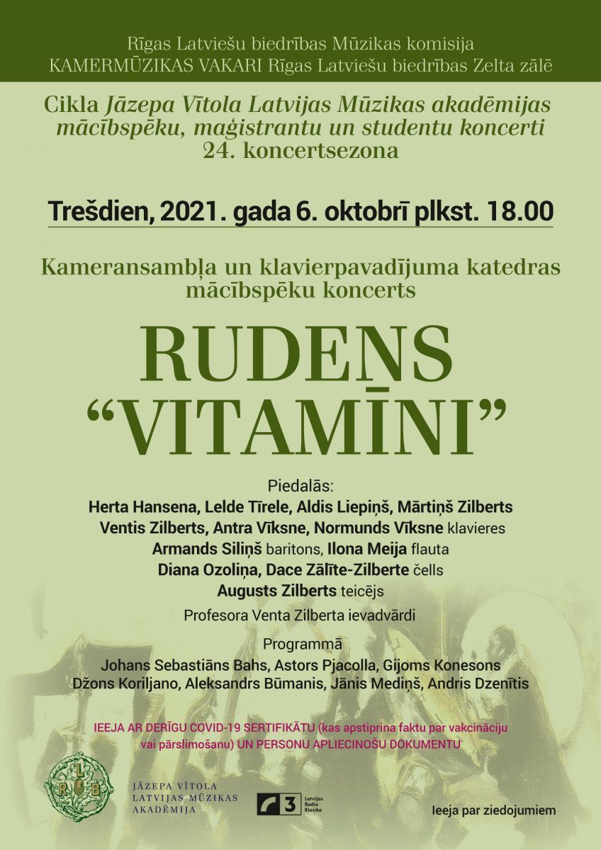 Rīgas Latviešu biedrības Mūzikas komiisja sadarbībā ar Jāzepa Vītola Latvijas Mūzikas akadēmiju 06.10.2021. plkst. 18.00 Rīgas Latviešu biedrības Zelta zālē aicina uz cikla "Jāzepa Vītola Latvijas Mūzikas akadēmijas mācībspēku, maģistrantu un studentu koncerti" 24. koncertsezonas kameransambļu un klavierpavadījuma katedras mācībspēku un absolventu koncertu RUDENS “VITAMĪNI”.