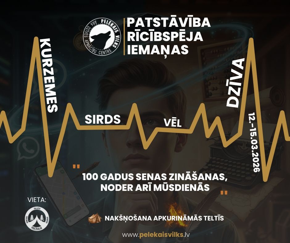 Āra dzīves apmācību centrs "Pelēkais vilks" aicina 12 - 18 gadus vecus jauniešus izmēģināt savus spēkus un papildināt savas zināšanas un prasmes mūsu āra dzīves nometnē "Kurzemes sirds vēl dzīva," kas notiks no 2026.gada 12. - 15. martam Kuldīgas apkaimē.