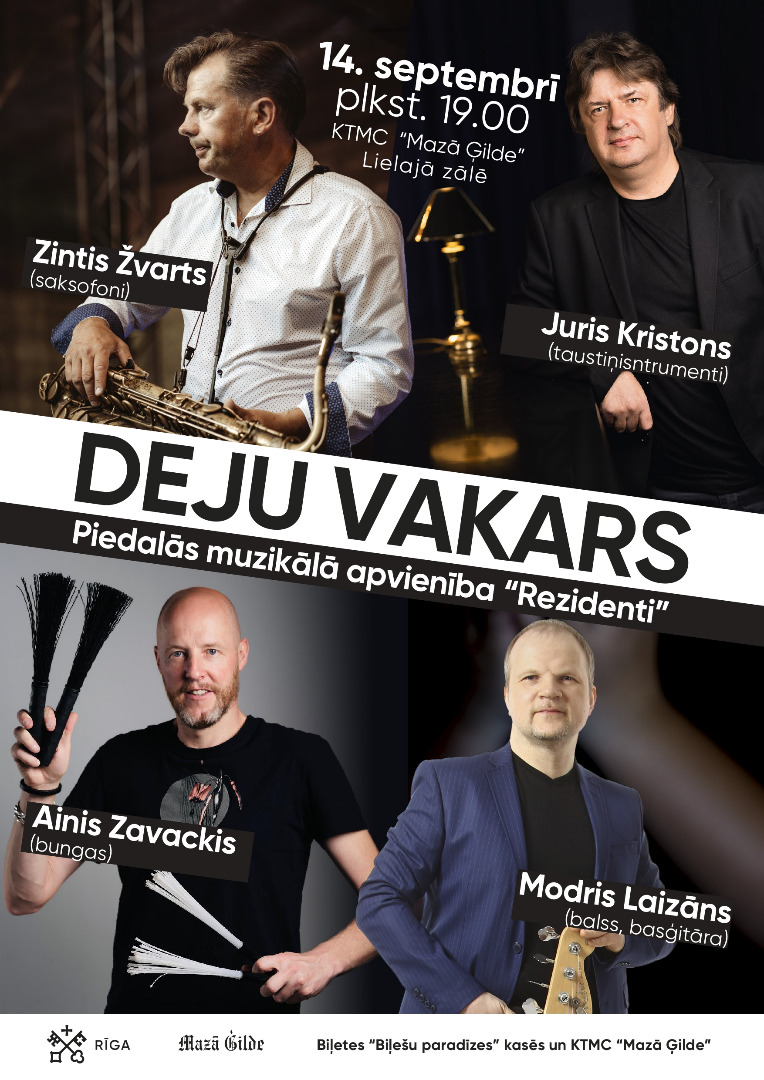 Kultūras un tautas mākslas centrs “Mazā Ģilde” 14. septembrī plkst. 19.00 ielūdz uz Deju vakaru ar muzikālo apvienību “Rezidenti”, kurā ikviens ar greznību un eleganci varēs izdejoties pēc sirds patikas!