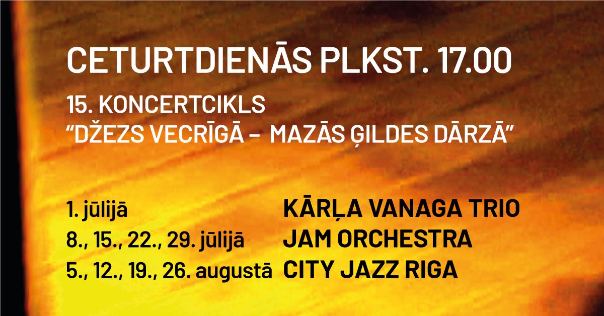 Šogad koncertciklam “Džezs vecrīgā – mazās ģildes dārzā” jau piecpadsmitā sezona! Turpinot tradīcijas, Mazā Ģilde vasaras mēnešos rīdziniekiem un Rīgas viesiem dāvina bezmaksas džeza koncertus ceturtdienu pēcpusdienās.