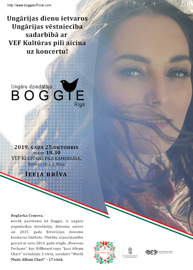 Ungārijas dienu ietvaros Ungārijas vēstniecība sadarbībā ar VEF Kultūras pili piedāvā mākslinieces Bolgarkas Čemeras, vairāk pazīstamas kā BOGGIE, koncertu. Bolgarka Čemera (BOGGIE) ir ungāru popmūzikas dziedātāja, dziesmu autore un 2015. gada Eirovīzijas dziesmu konkursa fināliste. Plašāku atpazīstamību guvusi ar savu 2014. gada singlu "Noveau Perfume", kas Billboard topa "Jazz Album Chart" ierindojās 3. vietā, savukārt "Word Music Album Chart" - 17. vietā.