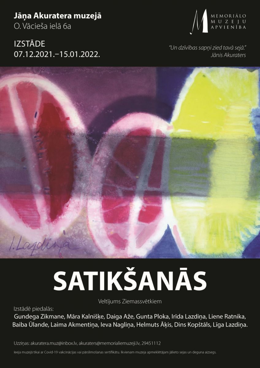 No 7. decembra līdz 15. janvārim Jāņa Akuratera muzejs (Rīgā, Ojāra Vācieša ielā 6a) aicina uz ikgadējo Rīgas Lutera draudzes mākslinieku grupas izstādi “Satikšanās”.