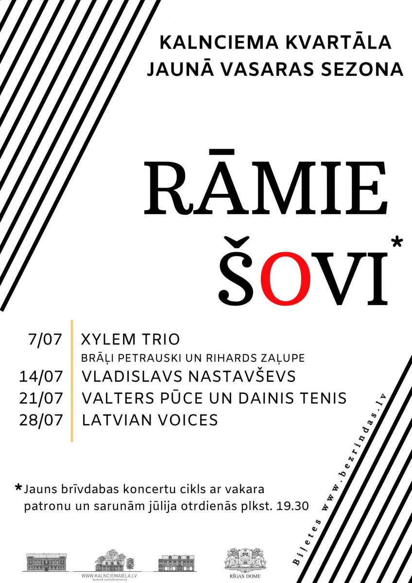 Kalnciema kvartāls sveic vasaru ar jaunu brīvdabas koncertu ciklu jūlijā un aicina uz “rāmajiem šoviem” otrdienu vakaros. Koncertus sniegs rūpīgi izvēlēti un atpazīstami Latvijas mūziķi, katru reizi būs arī īpašais viesis – vakara patrons, kurš aprunāsies ar mūziķiem un publiku par dzīvi un pēdējā laika pieredzēm.