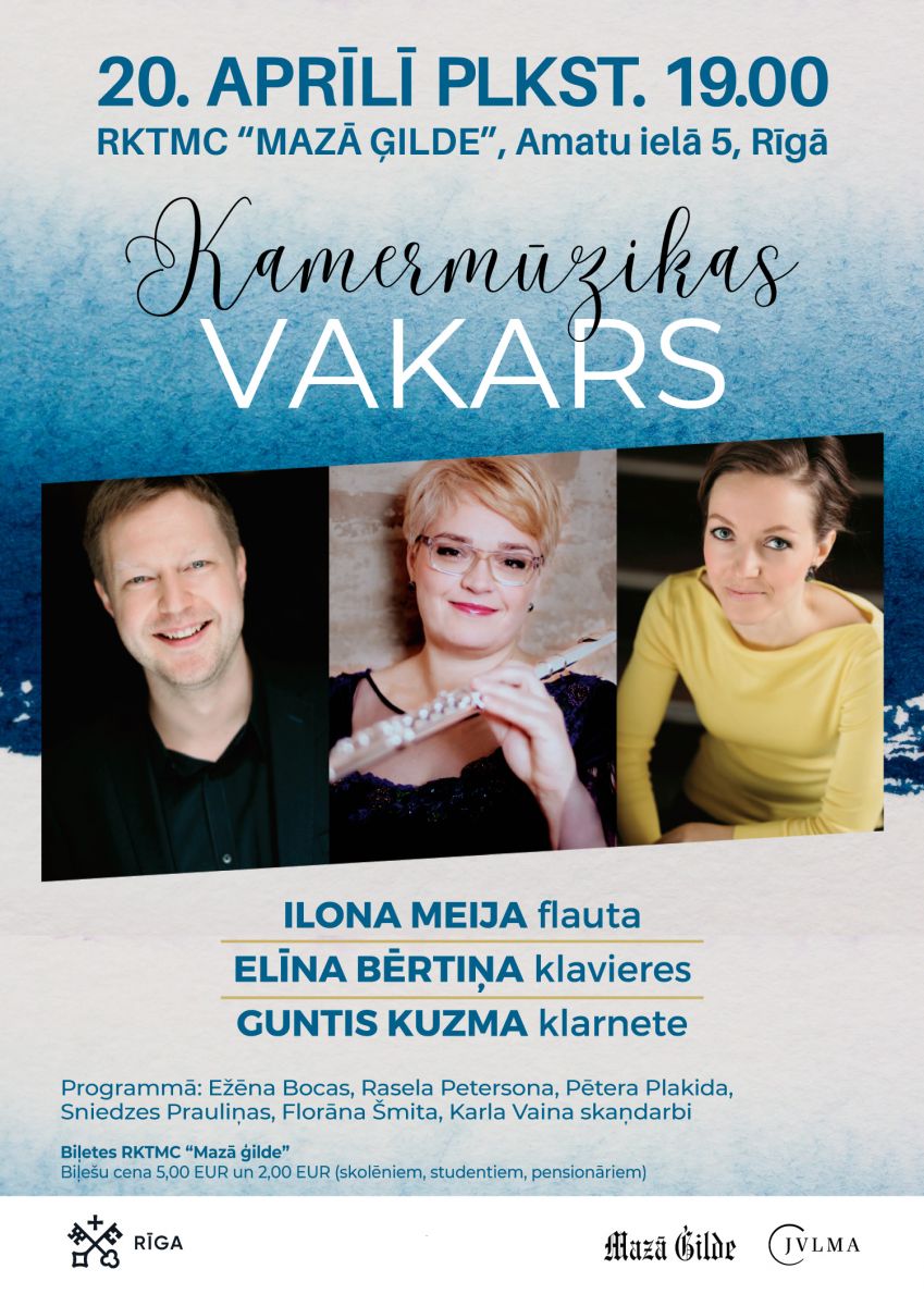 RKTMC “Mazā ģilde” 20. aprīlī plkst. 19.00 aicina uz JVLMA docentu Gunta Kuzmas (klarnete), Ilonas Meijas (flauta) un Elīnas Bērtiņas (klavieres) koncertu “Kamermūzikas vakars”.