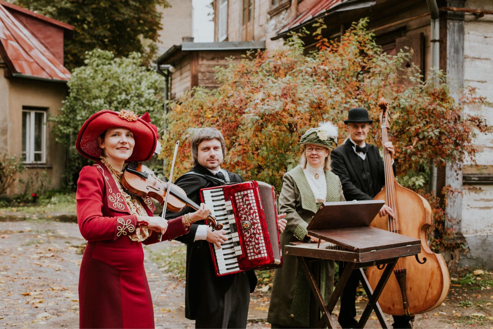 Kapelā muzicē: Zane Kriumane (vijole), Sandra Lipska (cītara), Ilmārs Pumpurs (kontrabass, mandolīna) un Rolands Zelčs (akordeons).
