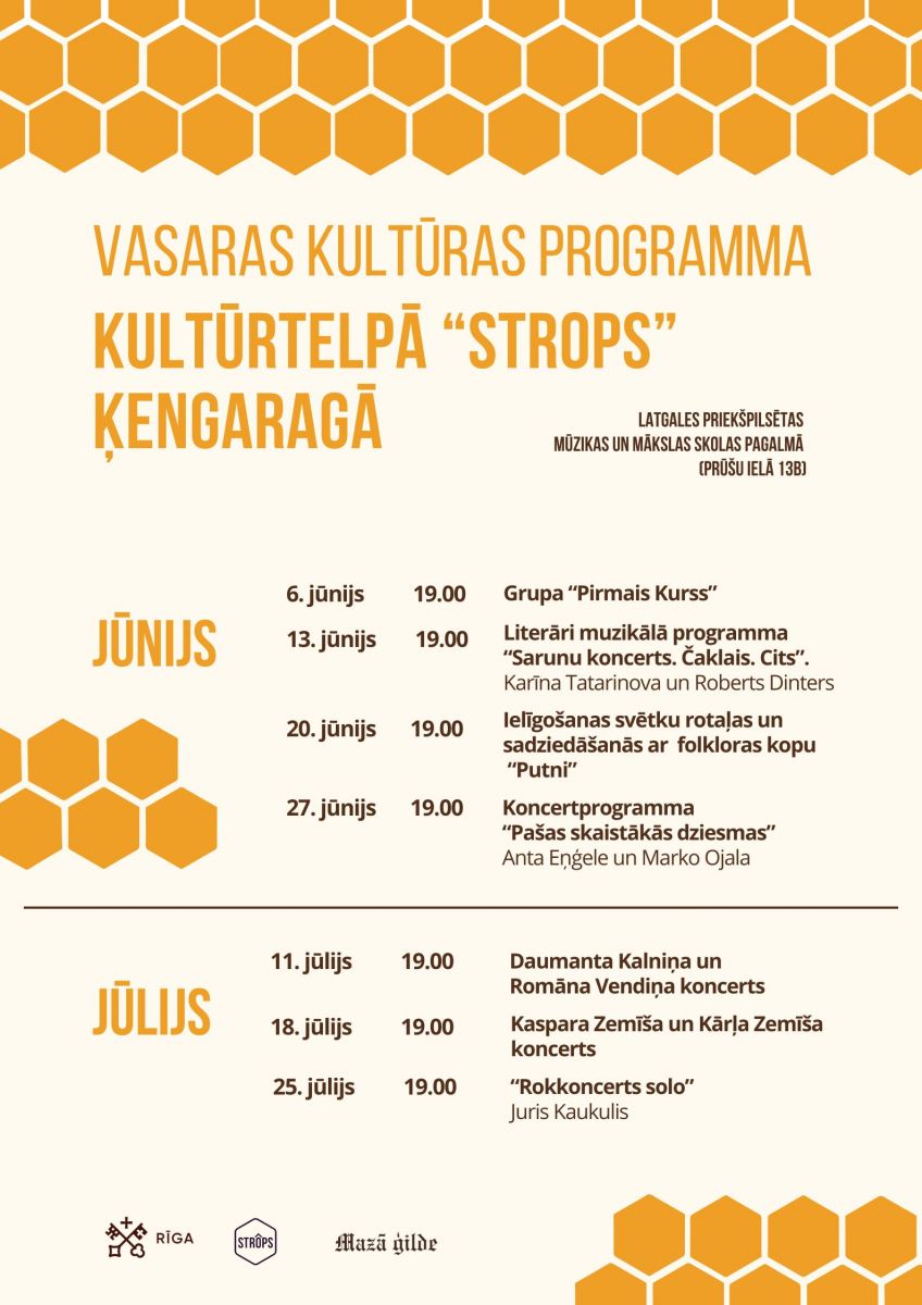 Jau otro gadu pēc kārtas, Vasaras kultūrtelpa “Strops” Ķengaragā, Latgales priekšpilsētas Mūzikas un mākslas skolas pagalmā (Prūšu ielā 13b), no 6. jūnija līdz 25. jūlijam katru ceturtdienu plkst. 19.00 uzstāsies dažādi Latvijas mūziķi.