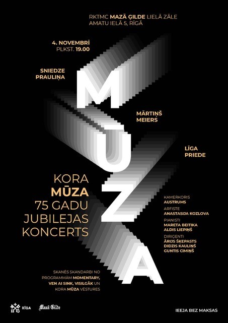 4. novembrī plkst. 19.00 Mazajā ģildē koris "Mūza" atzīmēs 75 gadu pastāvēšanu ar jubilejas koncertu un īpaši veidotu programmu, kurā būs iekļauti kora pēdējo gadu mūsdienu programmu opusi, korim veltīti komponistu skaņdarbi, kā arī kora vēsturē nozīmīgi latviešu komponistu skaņdarbi. Uz koncertu aicināti visi kormūzikas interesenti, ieeja bez maksas.