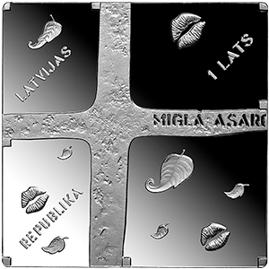 3. Miglā asaro logs. Grafiskais dizains: Ilmārs Blumbergs. Plastiskais veidojums: Ligita Franckeviča. 2011. Averss un reverss. Publicitātes foto. Apbalvojumi: Latvijas gada monēta (2011). 1. vieta Krievijas numismātikas publikāciju izdevniecības “Water Mark” konkursā “Monētu zvaigznājs” (“Монетное созвездие”) nominācijā “Unikāls mākslinieciskais risinājums” (2012). Balva nominācijā “Mākslinieciskākā monēta” (“Most Artistic Coin”) ASV numismātikas publikāciju izdevniecības “Krause Publications” un tās izdotā žurnāla “World Coin News” organizētajā konkursā “Gada monēta” (“Coin of the Year”) (2013).