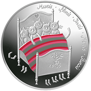 4. Pieci kaķi. Grafiskais dizains: Anita Paegle. Plastiskais veidojums: Jānis Strupulis. 2015. Averss un reverss. Publicitātes foto. Apbalvojumi: Latvijas gada monēta (2015).
