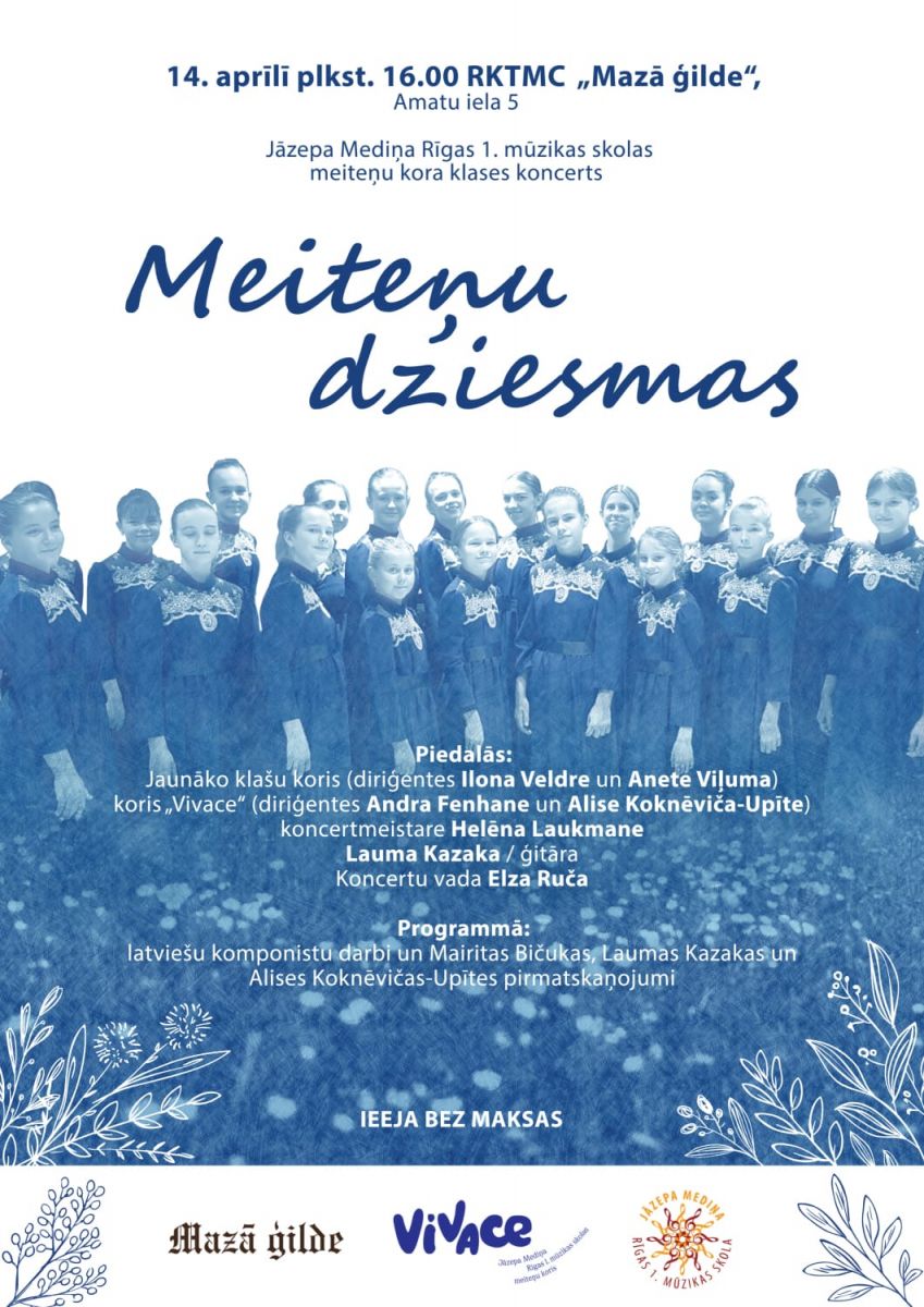 2024. gada 14. aprīlī plkst. 16.00 Mazajā ģildē norisināsies koncerts “Meiteņu dziesmas”, piedaloties Jāzepa Mediņa Rīgas 1. mūzikas skolas meiteņu kora klases audzēknēm. Koncertā izskanēs latviešu komponistu skaņdarbi meiteņu korim, tajā skaitā arī vairāki pirmatskaņojumi. Tāpat kora mūziku papildinās dzejas rindas kādreizējās kora dziedātājas Elzas Ručas lasījumā.