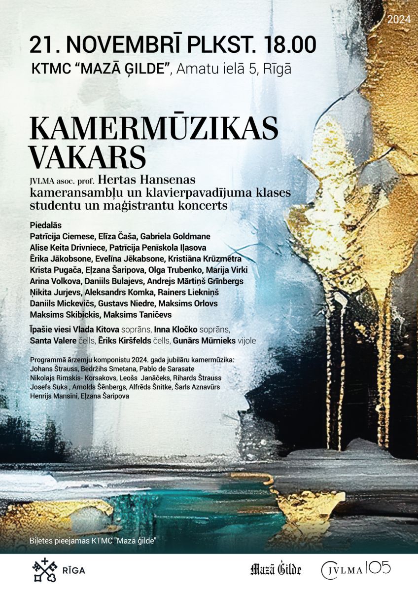21. novembrī plkst. 18.00 Kultūras un tautas mākslas centra “Mazā ģilde” Lielajā zālē izskanēs kamermūzikas koncerts, kurā muzicēs Jāzepa Vītola Latvijas Mūzikas akadēmijas asociētās profesores Hertas Hansenas klavierpavadījuma un kameransambļa klases studenti.