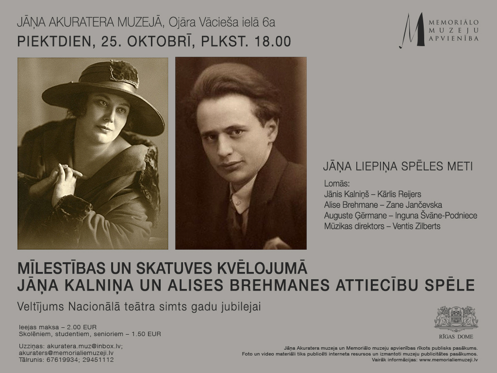 Piektdien, 25. oktobrī, plkst. 18.00, Jāņa Akuratera muzejā, Rīgā, Ojāra Vācieša ielā 6a notiks mūzikas, vēstuļu un dialogu spēles „Mīlestības un skatuves kvēlojumā” pirmizrāde, kas veltīta Nacionālā teātra simts gadu jubilejai. Tā vēstīs par Nacionālā teātra 20.–30. gadu slavenībām Alisi Brehmani un Jāni Kalniņu, kuru lomās iejutīsies Nacionālā teātra aktieri Zane Jančevska un Kārlis Reijers.