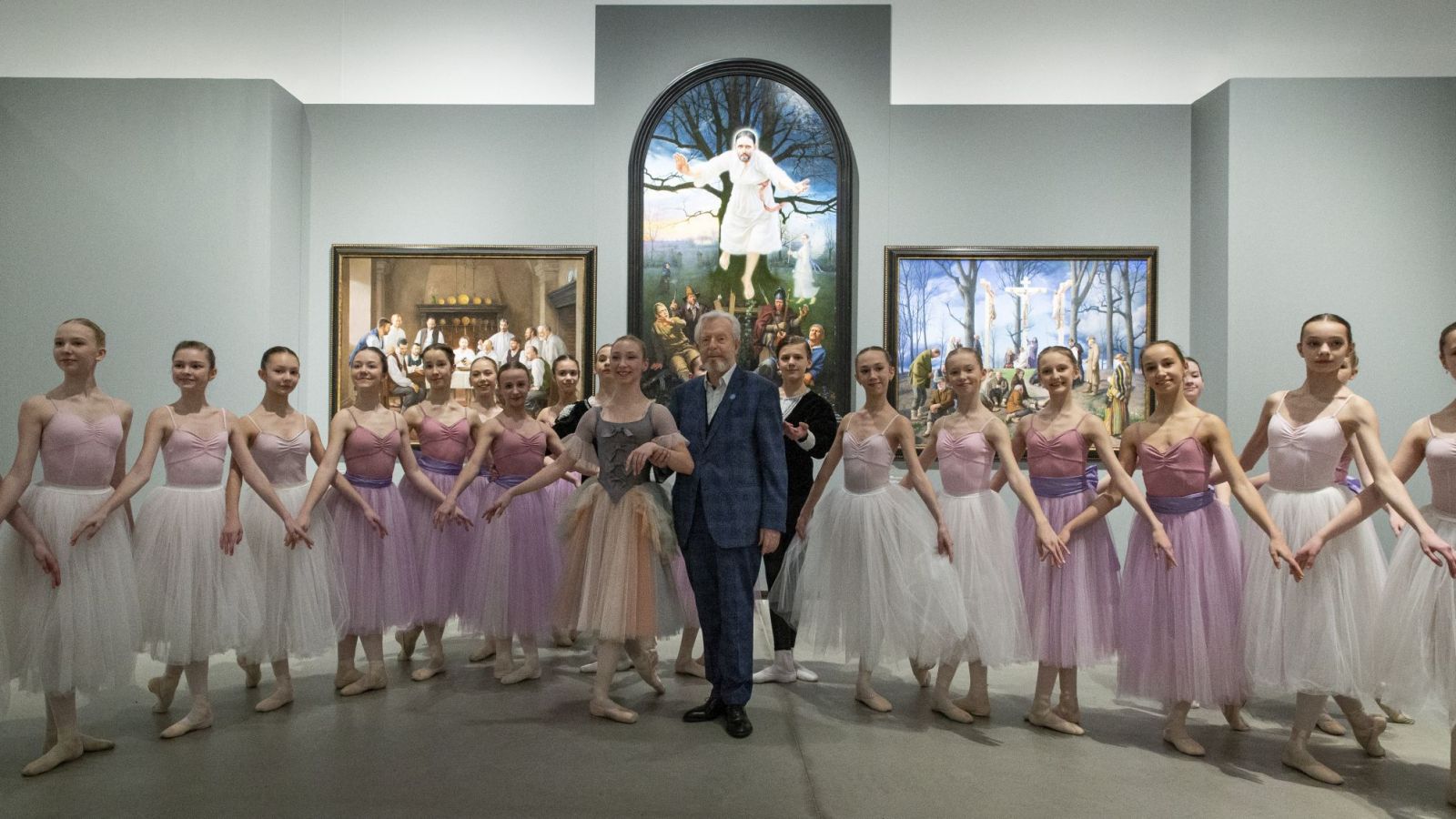 Imants Lancmanis ar Rīgas Baleta skolas audzēknēm savas personālizstādes “Imanta Lancmaņa māksla” noslēguma dienā 26.02.2023. Latvijas Nacionālajā mākslas muzejā. Foto Inga Baltā
