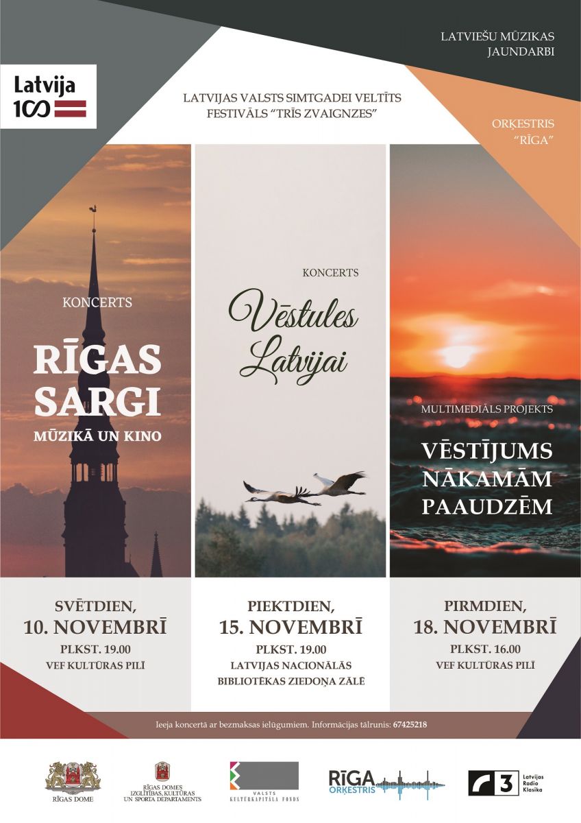 Ar trim latviešu mūzikas koncertiem Orķestris “Rīga” noslēgs Latvijas valsts simtgadei veltītu festivālu “Trīs zvaigznes”. Festivāls noritējis trīs gadus ar mērķi iespējami daudzveidīgāk un saistošāk interpretēt jau esošu un jaunradītu latviešu komponistu mūziku, veidojot koncertus, kas tematiski piesaistīti dažādām Latvijai aktuālām tēmām. Šajā gadā festivāls norisināsies laikā no 10. novembra līdz 18. novembrim.