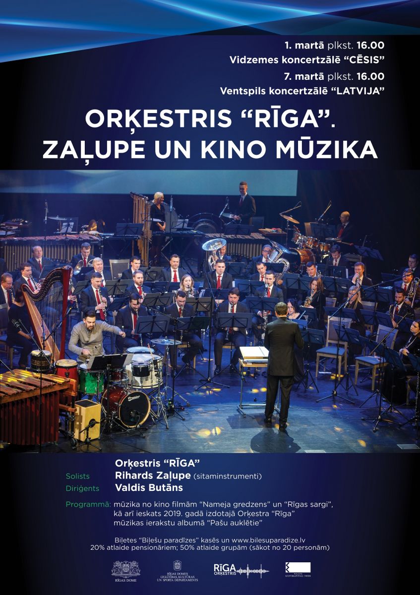 “Orķestris “Rīga”. Zaļupe un kino mūzika” – tā ir unikāla koncertprogramma, kas skanēs 1. martā Vidzemes koncertzālē “Cēsis” un 7. martā Ventspils koncertzālē “Latvija”. Piedalīsies Orķestris “Rīga” diriģenta Valda Butāna vadībā un solists Rihards Zaļupe.