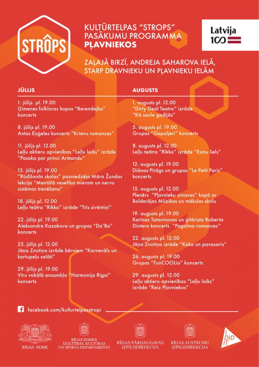 Jūlija sākumā darbu atsāks un līdz pat augusta beigām Pļavnieku un Ziepniekkalna apkaimēs apmeklētājus gaidīs mobilās kultūrtelpas „Strops”, piedāvājot dažādus neliela formāta koncertus, izrādes un pasākumus.