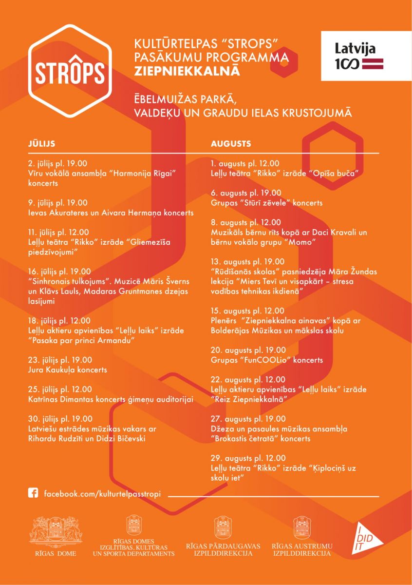 Kultūrtelpas „Strops” šogad Rīgas pilsētā darbosies jau ceturto sezonu. Iepriekšējos gados tās pabijušas arī Mežaparka un Ķengaraga apkaimēs, bet šogad, tāpat kā pērn, „Stropu” pasākumi notiks Ziepniekkalnā un Pļavniekos.