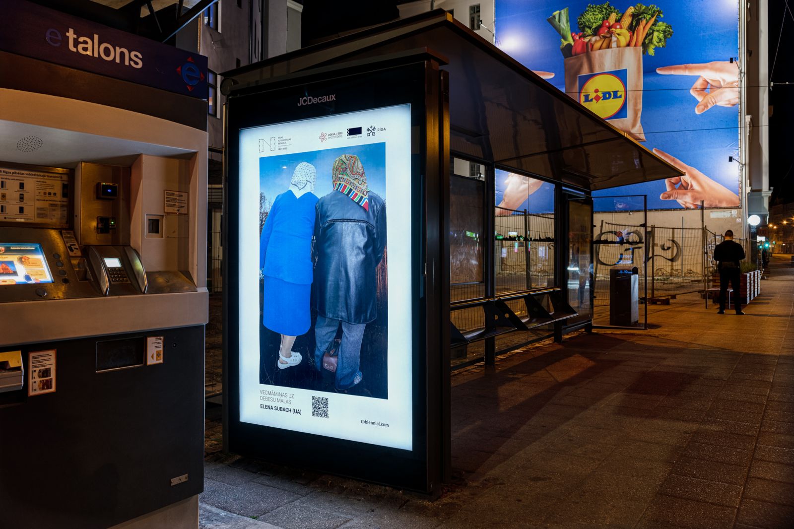 No 29. maija līdz 11. jūnijam 10 Rīgas sabiedriskā transporta pieturvietās skatāms Rīgas Fotogrāfijas biennāles – NEXT 2023 ārtelpas projekts, ukraiņu mākslinieces Jeļenas Subačas (Elena Subach) darbu sērija “Vecmāmiņas uz debesu malas”.