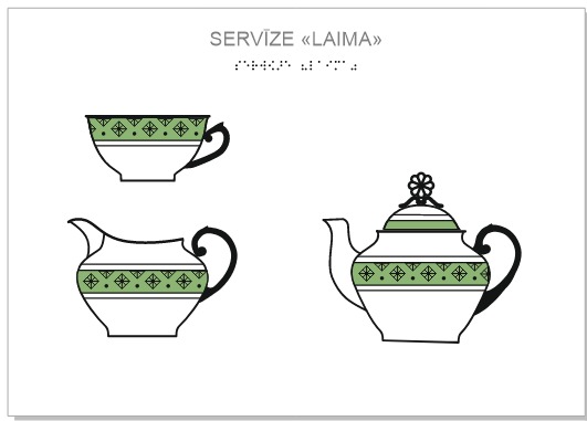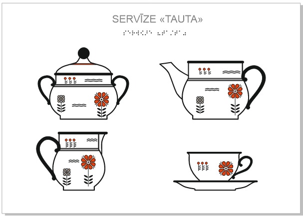 01_ Albuma “Pieksarties porcelānam” lappuse ar tējas servīzes “Tauta” taktilo attēlu. Maketa autore Marija Kožarina / Rīgas Porcelāna muzejs. 2025.