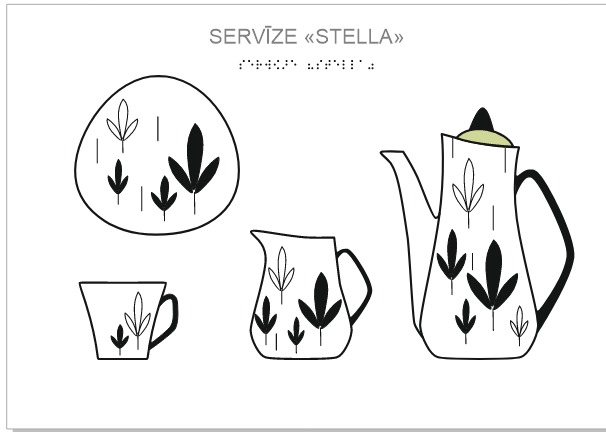 03_ Albuma “Pieksarties porcelānam” lappuse ar tējas servīzes “Stella” taktilo attēlu. Maketa autore Marija Kožarina / Rīgas Porcelāna muzejs. 2025.