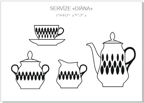 04_ Albuma “Pieksarties porcelānam” lappuse ar tējas servīzes “Diāna” taktilo attēlu. Maketa autore Marija Kožarina / Rīgas Porcelāna muzejs. 2025.