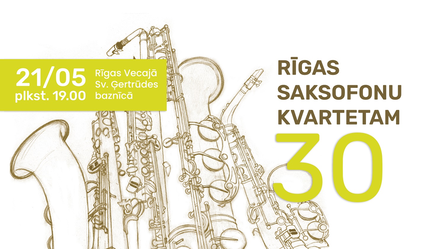 Rīgas Saksofonu kvartets aicina uz 30 gadu jubileju. Līdzās kvarteta mūziķiem koncertā piedalīsies viņu muzikālie domubiedri, kamerkoris Ave Sol un diriģents Jurģis Cābulis. Par koncerta norises vietu izraudzīta Rīgas Vecā Sv. Ģertrūdes baznīca, kas tiks piepildīta ar garīgi spēcinošu latviešu komponistu mūziku. Koncerts notiks 21. maijā plkst. 19.00.