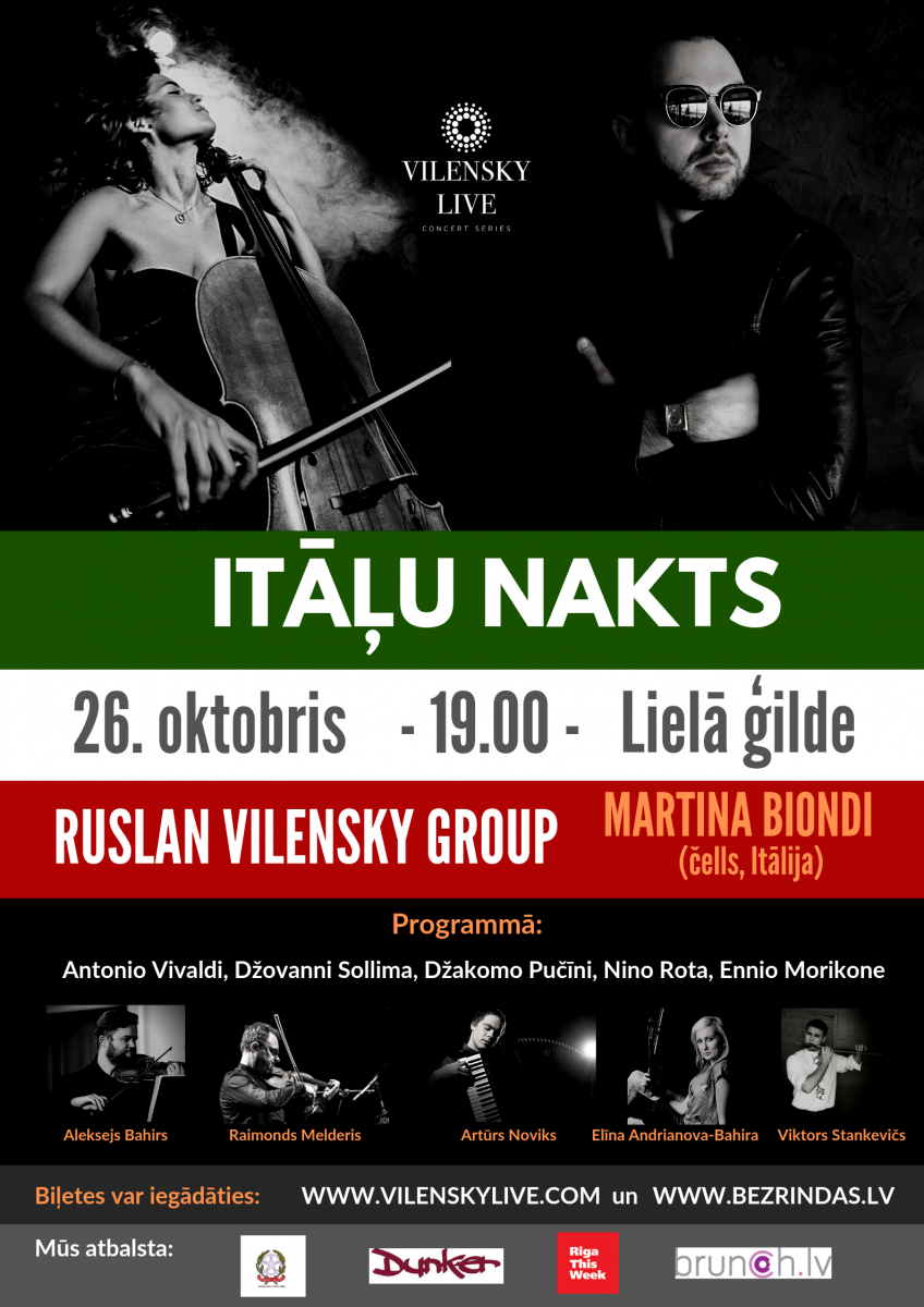 26. oktobrī, plkst. 19.00, Lielajā Ģildē notiks pazīstamā čellista Ruslana Viļenska (Ruslan Vilensky) koncerts. Viņš ar savu stīgu instrumentu grupu prezentēs Rīgas publikai muzikālu projektu "Itāļu nakts 2019". Pasākuma īpašā viešņa būs talantīgā itāļu čelliste, "Orchestra Giovanile Luigi Cherubini" pirmais čells Martina Biondi (Martina Biondi).