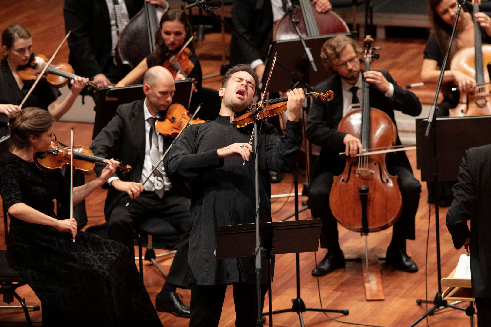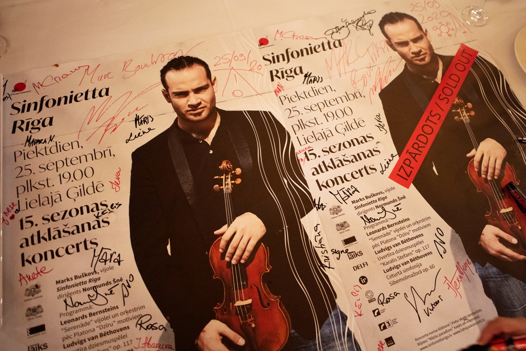 Ar gavilēm publika sveica Karalienes Elizabetes un Pētera Čaikovska konkursu laureātu, beļģu vijolnieku Marku Buškovu. Mākslinieciski spilgti un virtuozi viņa sniegumā skanēja amerikāņu komponista Leonarda Bernsteina jaunības dienu opuss vijolei, stīgām un sitaminstrumentiem “Serenāde, pēc Platona “Dzīru” motīviem”. Bernsteins antīkās pasaules filosofu ideju traktējumam piegājis konceptuāli, radot piecus atšķīrīgus sarunu dalībnieku vēstījumus par mīlestību. Idejām muzikālu formu radušas Faidra, Aristofāna, Eriksamaha, Agatona un Sokrāta monologi.