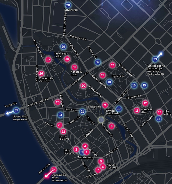 Šis, protams, nebūt nav vienīgais objektu apskates maršruts, tikai viens no tā iespējamiem variantiem. Turklāt der atcerēties arī par paralēlo "Staro Rīga" sadarbības partneru programmu, kurā ietilpst vēl 12 gaismas objekti. Un vēl noteikti noderēs info centrs pie "Laimas" pulksteņa vai festivāla mobilā aplikācija savā telefonā.