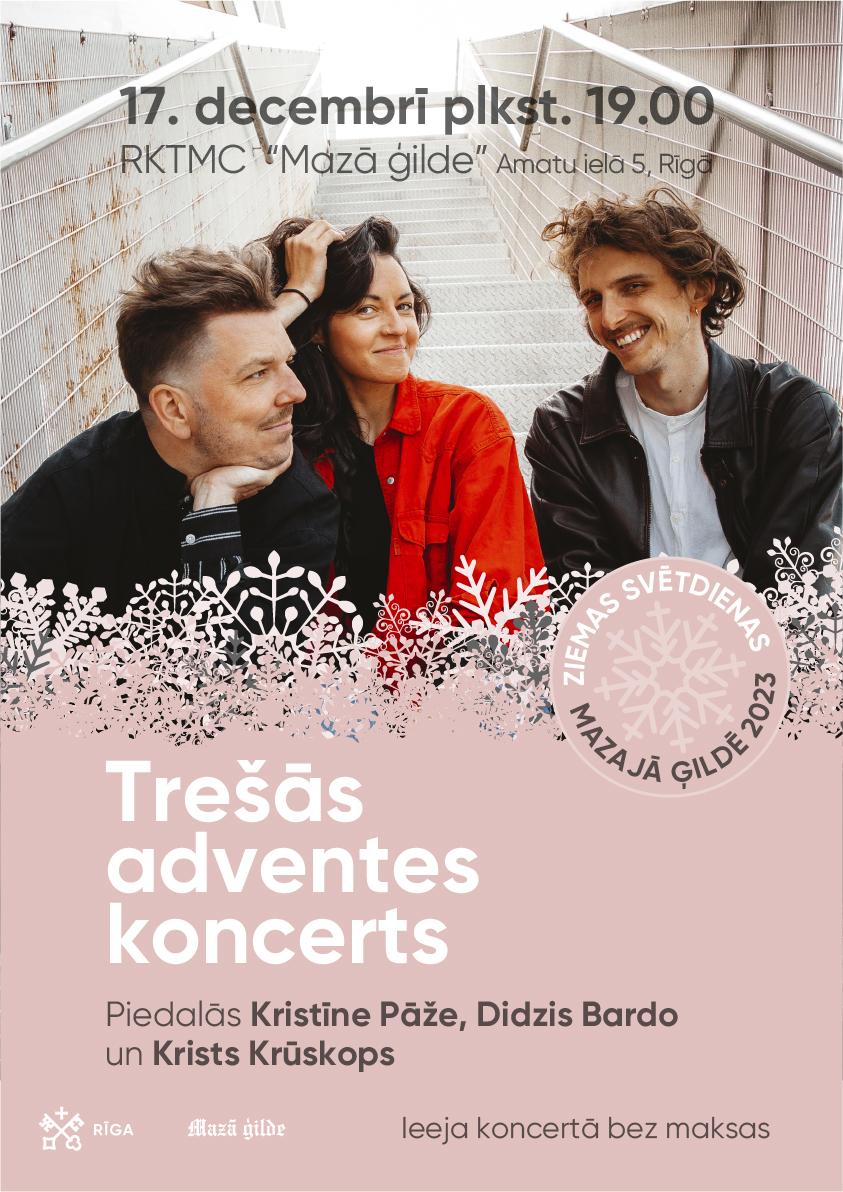 17. decembrī plkst. 19.00 Rīgas kultūras un tautas mākslas centra “Mazā ģilde” Lielajā zālē notiks Trešās adventes koncerts, kas noslēgs koncertu sēriju "Ziemas svētdienas Mazajā ģildē 2023". Koncertā uzstāsies Kristīne Pāže, Didzis Bardo un Krists Krūskops.