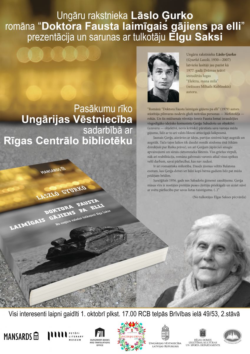 1.oktobrī, plkst. 17.00 Ungārijas vēstniecība sadarbībā ar Rīgas Centrālo bibliotēku rīkos ungāru rakstnieka Lāslo Ģurko romāna “Doktora Fausta laimīgais gājiens pa elli” prezentāciju.