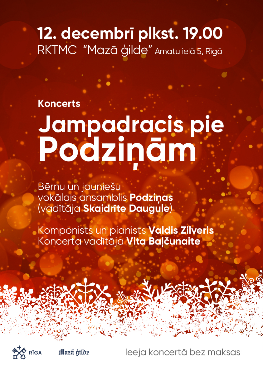 12. decembrī plkst. 19.00 Rīgas kultūras un tautas mākslas centra “Mazā ģilde” Lielajā zālē aicinām ģimenes uz Ziemassvētku koncertu “Jampadracis pie “Podziņām””. Koncertā uzstāsies RKTMC “Mazā ģilde” bērnu un jauniešu vokālais ansamblis “Podziņas” (vadītāja Skaidrīte Daugule), komponists un pianists Valdis Zilveris. Koncertu vadīs aktrise Vita Baļčunaite.